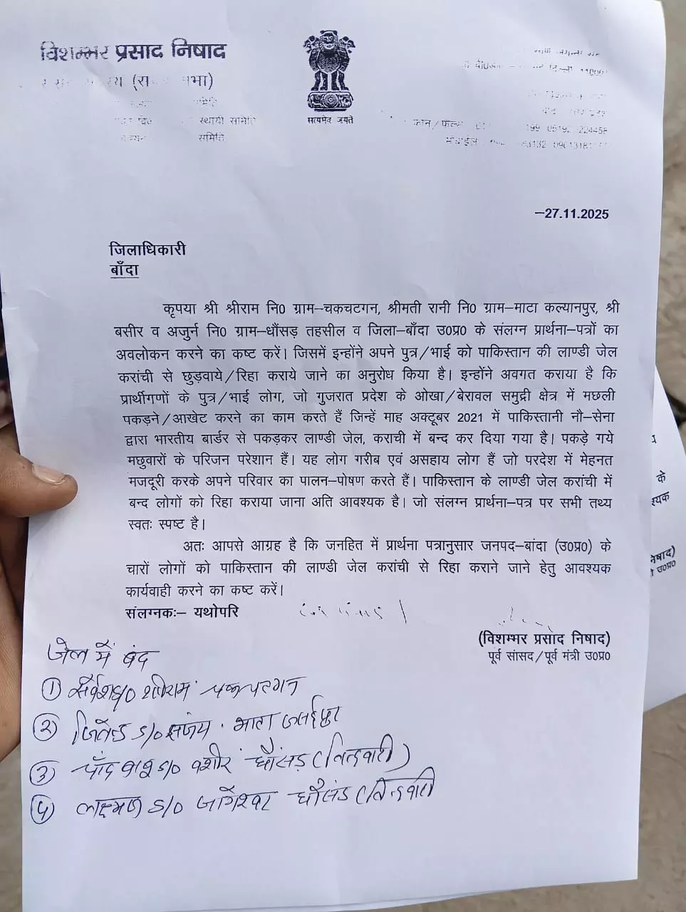 सांसद विशंभर प्रसाद निषाद ने जिलाधिकारी से अनुरोध किया कि जनहित को ध्यान में रखते हुए बांदा के इन चारों मछुआरों की पाकिस्तान की लांडी जेल, कराची से रिहाई सुनिश्चित कराने हेतु उचित पहल की जाए।