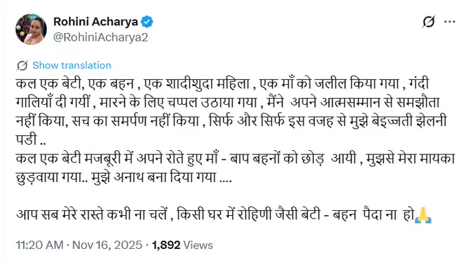 एक अन्य पोस्ट में रोहिणी ने अपने त्याग पर उठाए गए सवालों का दर्दनाक ज़िक्र किया। उन्होंने कहा- “कल मुझे गालियाँ दी गईं और कहा गया कि मैं गंदी हूं, और मैंने अपने पिता को अपनी गंदी किडनी लगवा दी। कहा गया कि करोड़ों रुपये लिए और टिकट लिया तब लगवाई गंदी किडनी…”